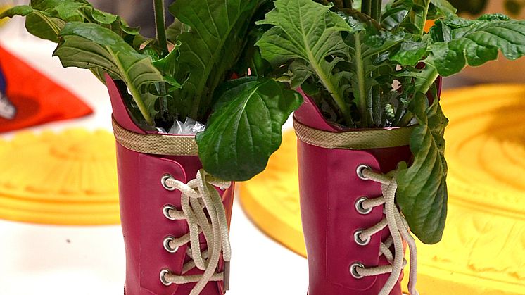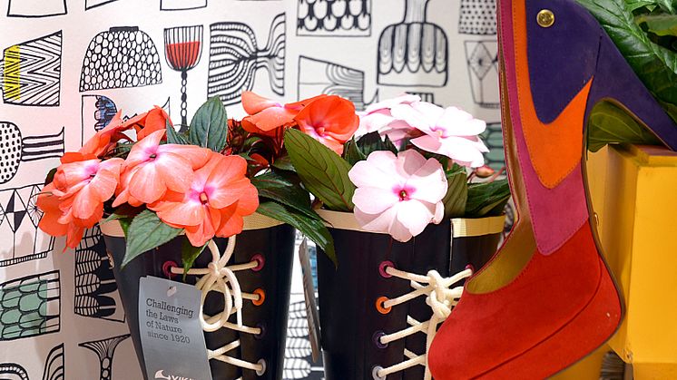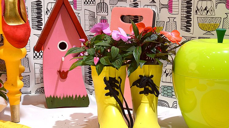 Upp och ner vända krukor, stövlar, färgglada byråer.