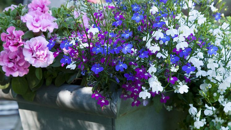 Dagens plantering som består av en härligt åldrad zinkkruka planterad med storblommig hänglobelia (Lobelia erinus) i flera olika färger som kompletteras med en vackert romantisk dubbelblommande Surfinia (Petunia Surfiniaserien)