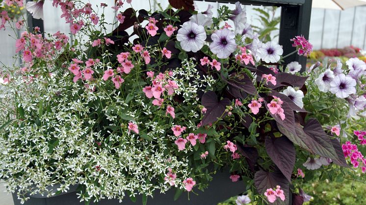 Recept på en lyckad plantering maj-juni innehåller en mix av från vänster till höger: Snötörel, Euphorbia ´Diamond Frost´ ; Tvillingsporre, Diascia barbarae ; Batat, Ipomoea batata ´Sweet Heart Purple´ ; Petunia, Petunia Surfiniaserien ; Trädgårdsverbena, Glandularia elegans.