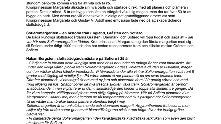 De båda kungliga slottsträdgårdarna Gråsten i Danmark och Sofiero vill ropa högst och säga att - det var här som Sofieromargeriten föddes. Kronprinsessan Margareta tog den första margeriten med sig till Sofiero under tidigt 1900-tal och den har sedan transporterats fram och tillbaka mellan Gråsten och Sofiero.