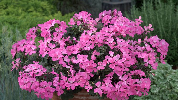 Kraftigväxande och marktäckande Pelargon med mörktonade blad