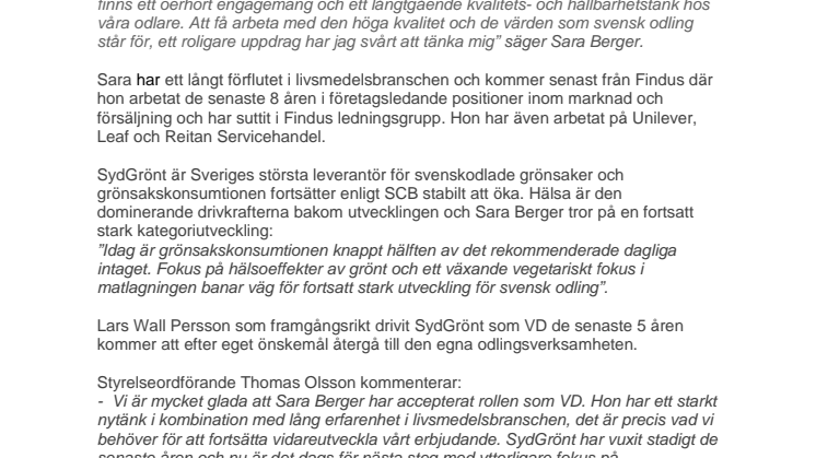 Idag, 16 oktober, tillträder Sara Berger som ny VD för SydGrönt. Med lång erfarenhet från livsmedelsbranschen har hon siktet inställt på att fortsätta arbetet med hög kvalitet i odlingen och med fokus på en ökad konsumtion av svenskodlade grönsaker.