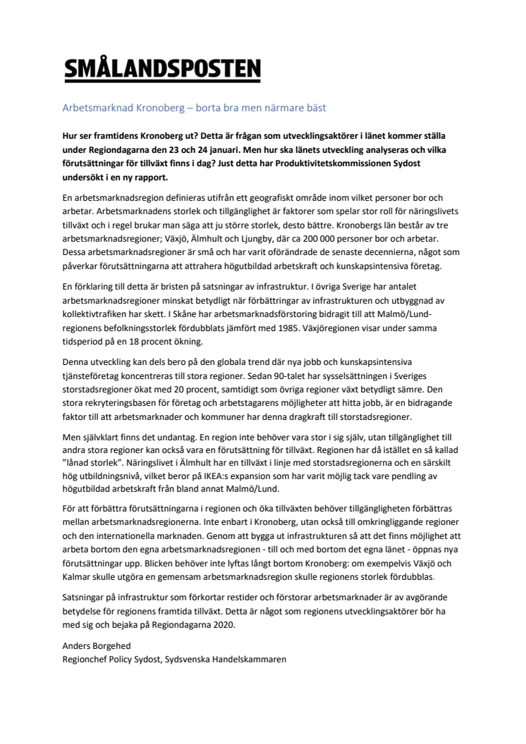 Smålandsposten: Hur ser framtidens Kronoberg ut? Detta är frågan som utvecklingsaktörer i länet kommer ställa under Regiondagarna den 23 och 24 januari. Men hur ska länets utveckling analyseras och vilka förutsättningar för tillväxt finns i dag? Just detta har Produktivitetskommissionen Sydost undersökt i en ny rapport.