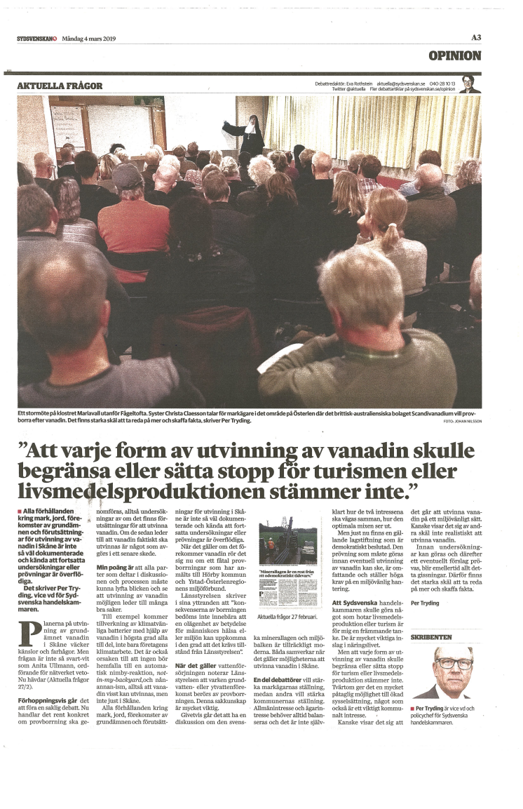 Sydsvenskan: Alla förhållanden kring mark, jord, förekomster av grundämnen och förutsättningar för utvinning av vanadin i Skåne är inte så väl dokumenterade och kända att fortsatta undersökningar eller prövningar är överflödiga.