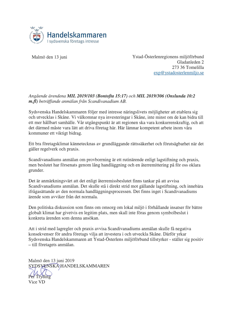 Sydsvenska Industri- och Handelskammaren följer med intresse näringslivets möjligheter att etablera sig och utvecklas i Skåne. Vi välkomnar nya investeringar i Skåne, inte minst om de kan bidra till ett mer hållbart samhälle. Vår utgångspunkt är att regionen ska vara konkurrenskraftig, och att det därmed måste vara lätt att driva företag här.