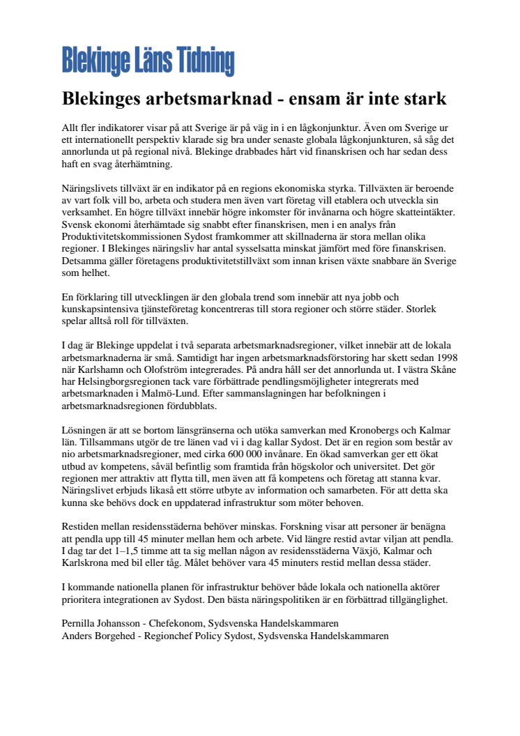 Allt fler indikatorer visar på att Sverige är på väg in i en lågkonjunktur. Även om Sverige ur ett internationellt perspektiv klarade sig bra under senaste globala lågkonjunkturen, så såg det annorlunda ut på regional nivå. Blekinge drabbades hårt vid finanskrisen och har sedan dess haft en svag återhämtning, skriver Sydsvenska Handelskammaren medarbetare Pernilla Johansson och Anders Borgehed.