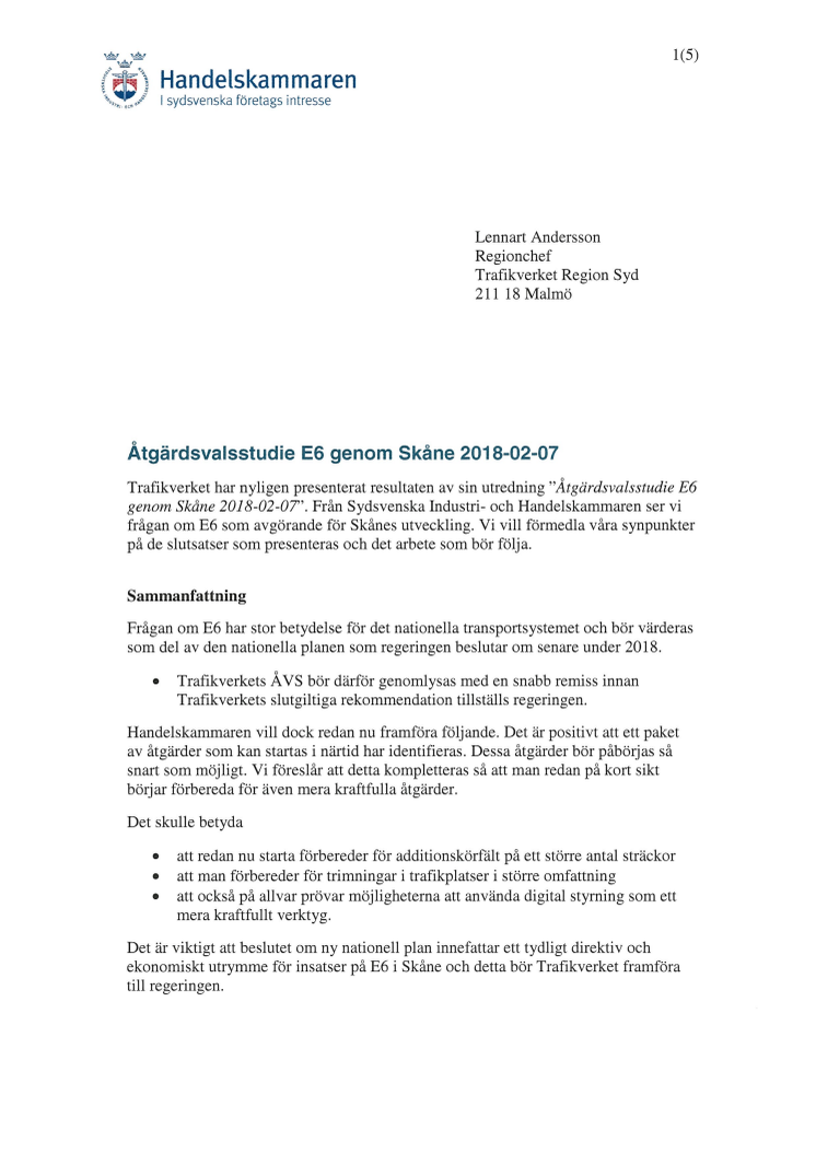 Trafikverket har nyligen presenterat resultaten av sin utredning ”Åtgärdsvalsstudie E6 genom Skåne 2018-02-07”. Från Sydsvenska Industri- och Handelskammaren ser vi frågan om E6 som avgörande för Skånes utveckling. Vi vill förmedla våra synpunkter på de slutsatser som presenteras och det arbete som bör följa.
