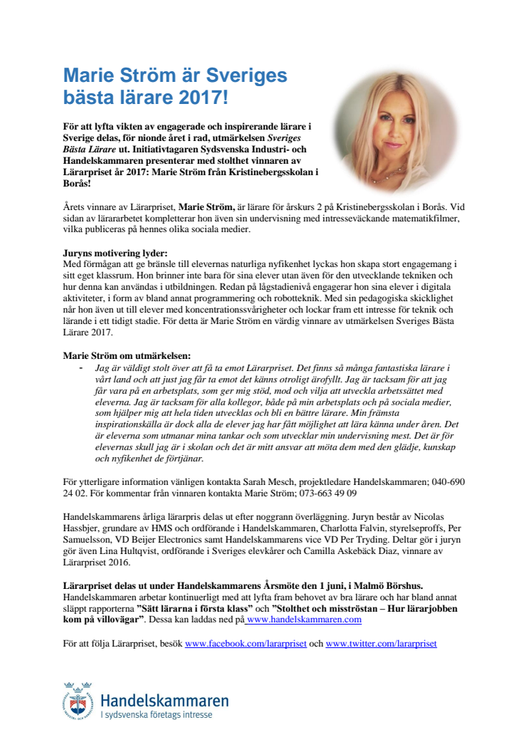 För att lyfta vikten av engagerade och inspirerande lärare i Sverige delas, för nionde året i rad, utmärkelsen Sveriges Bästa Lärare ut. Initiativtagaren Sydsvenska Industri- och Handelskammaren presenterar med stolthet vinnaren av Lärarpriset år 2017: Marie Ström från Kristinebergsskolan i Borås!