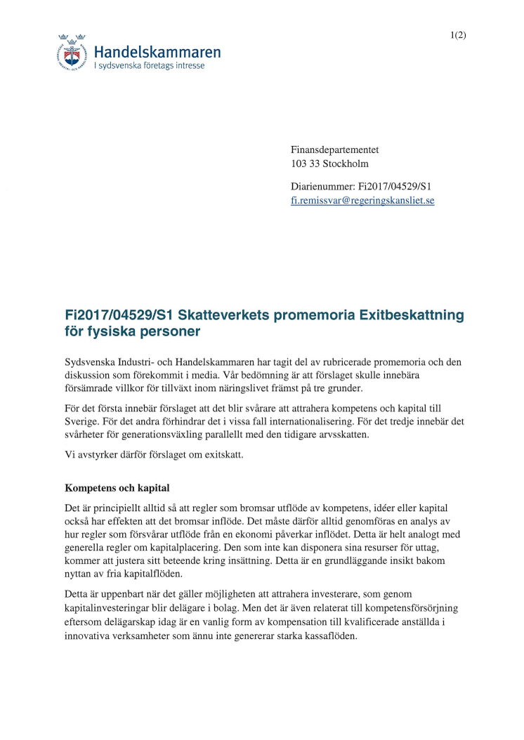 Sydsvenska Industri- och Handelskammaren har tagit del av rubricerade promemoria och den diskussion som förekommit i media. Vår bedömning är att förslaget skulle innebära försämrade villkor för tillväxt inom näringslivet främst på tre grunder.