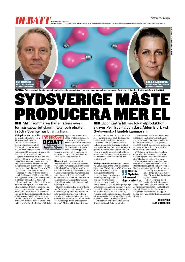 Kvällsposten: Näringslivet storsatsar för att minska klimatavtrycken. Tillverkningsindustrin tillverkar elektrifierade fordon, tjänstesektorn träffas digitalt och basindustrin elektrifierar stora processer. Gemensamt för dessa satsningar är att de är beroende av elektricitet.