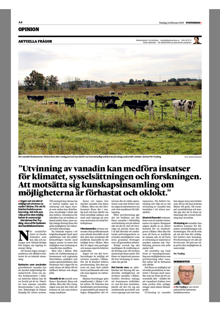Sydsvenskan: Ingen vet om det är möjligt att utvinna vanadin i Skåne. För att få klarhet behövs provborrning. Att inte ens vilja pröva den möjligheten är oansvarigt. Det skriver Per Tryding, vice vd för Sydsvenska handelskammaren.