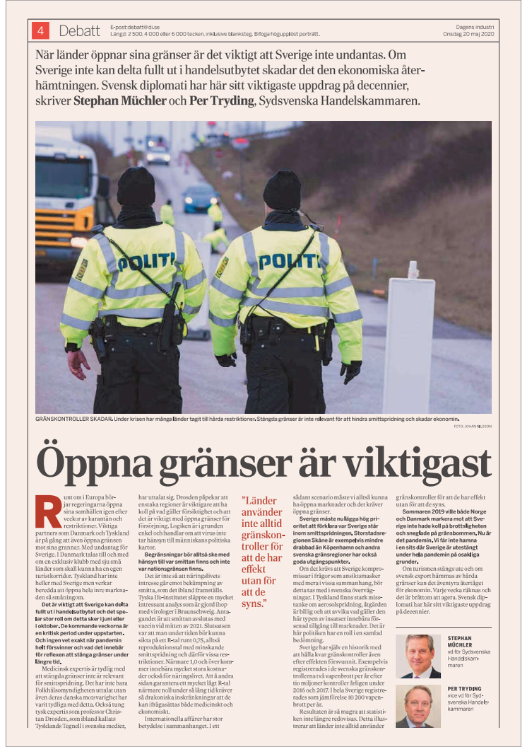 Dagens Industri: När länder öppnar sina gränser är det viktigt att Sverige inte undantas. Om Sverige inte kan delta fullt ut i handelsutbytet skadar det den ekonomiska återhämtningen. Svensk diplomati har här sitt viktigaste uppdrag på decennier, skriver Stephan Müchler och Per Tryding, Sydsvenska Handelskammaren.