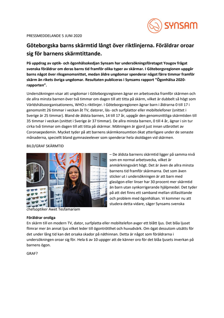 På uppdrag av optik- och ögonhälsokedjan Synsam har undersökningsföretaget Yougov frågat svenska föräldrar om deras barns tid framför olika typer av skärmar. I Göteborgsregionen uppgår barns något över riksgenomsnittet, medan äldre ungdomar spenderar något färre timmar framför skärm än rikets övriga ungdomar. Resultaten publiceras i Synsams rapport ”Ögonhälsa 2020-rapporten”.