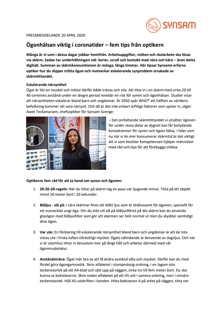 Många är vi som i dessa dagar jobbar hemifrån. Arbetsuppgifter, möten och skolarbete ska lösas via skärm. Sedan tar underhållningen vid: Serier, scroll och kontakt med nära och kära – även detta digitalt. Summan av skärmkonsumtionen är många, långa timmar. Här tipsar Synsams erfarna optiker hur du slipper trötta ögon och motverkar eskalerande synproblem orsakade av skärmtittandet.