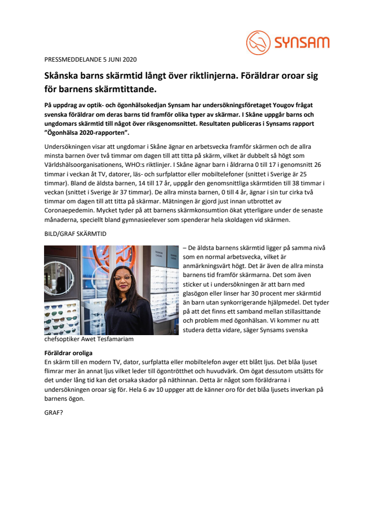 På uppdrag av optik- och ögonhälsokedjan Synsam har undersökningsföretaget Yougov frågat svenska föräldrar om deras barns tid framför olika typer av skärmar. I Skåne uppgår barns och ungdomars skärmtid till något över riksgenomsnittet. Resultaten publiceras i Synsams rapport ”Ögonhälsa 2020-rapporten”.