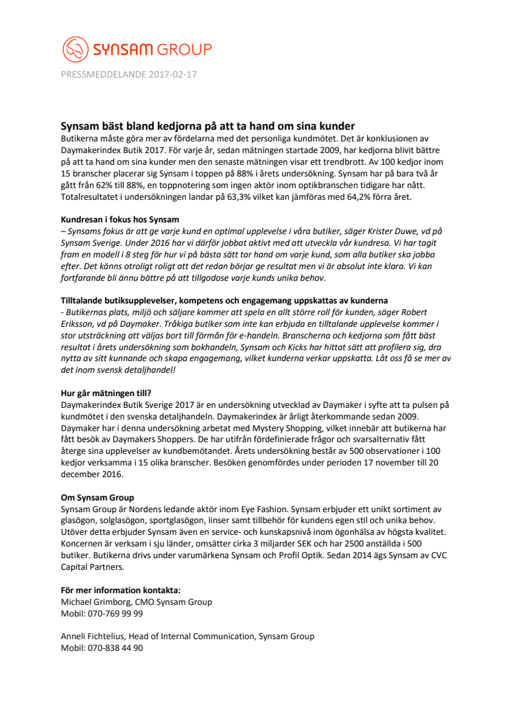 Butikerna måste göra mer av fördelarna med det personliga kundmötet. Det är konklusionen av Daymakerindex Butik 2017. Av 100 kedjor inom 15 branscher placerar sig Synsam i toppen på 88% i årets undersökning. Synsam har på bara två år gått från 62% till 88%, en toppnotering som ingen aktör inom optikbranschen tidigare har nått.
