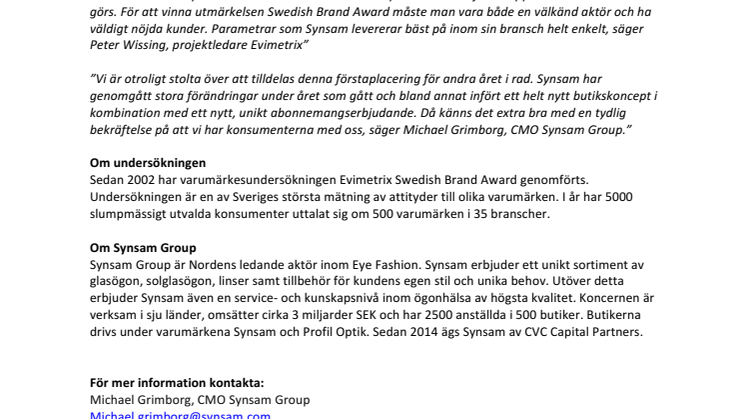”Vi är otroligt stolta över att tilldelas denna förstaplacering för andra året i rad. Synsam har genomgått stora förändringar under året som gått och bland annat infört ett helt nytt butikskoncept i kombination med ett nytt, unikt abonnemangserbjudande. Då känns det extra bra med en tydlig bekräftelse på att vi har konsumenterna med oss, säger Michael Grimborg, CMO Synsam Group.”