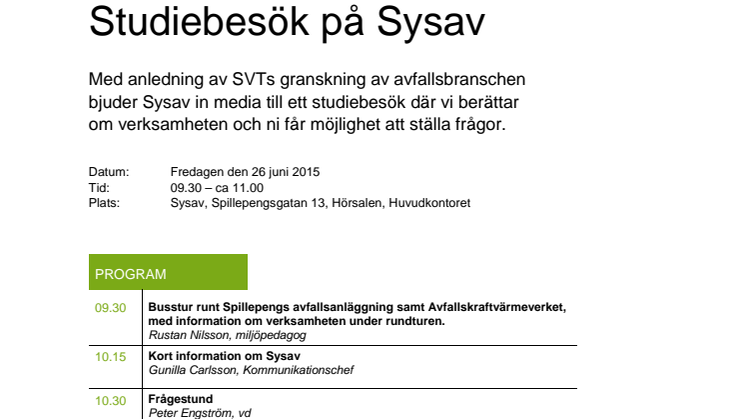 Anmälan sker på www.sysav.se/pressinbjudan senast torsdagen den 25 juni. Har ni frågor om besöket? Maila gärna på info@sysav.se.