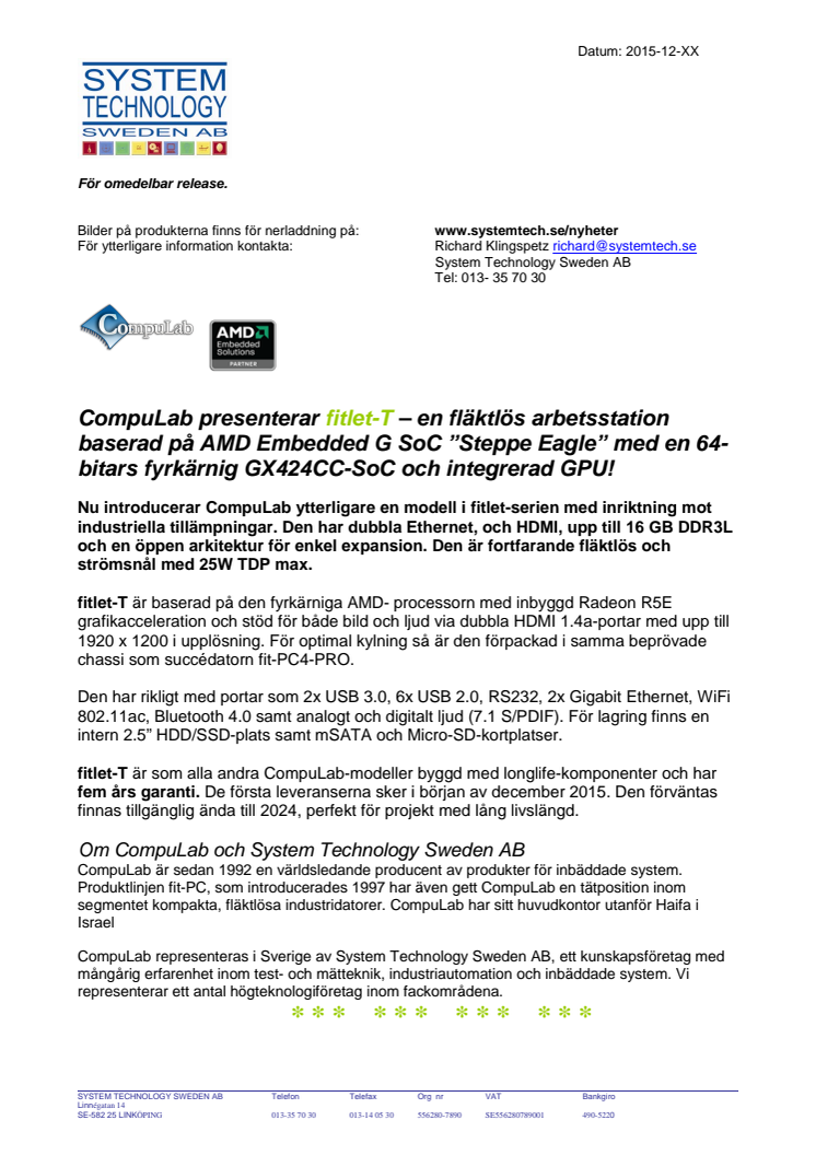 Nu introducerar CompuLab ytterligare en modell i fitlet-serien med inriktning mot industriella tillämpningar. Den har dubbla Ethernet, och HDMI, upp till 16 GB DDR3L och en öppen arkitektur för enkel expansion. Den är fortfarande fläktlös och strömsnål med 25W TDP max.