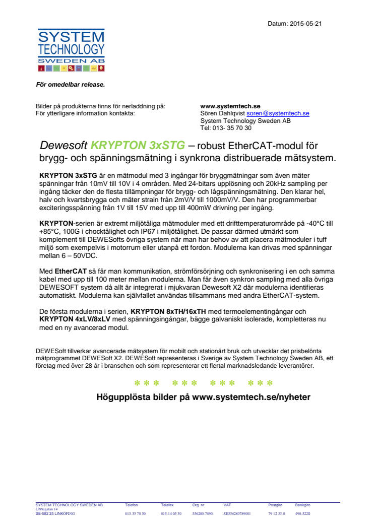 KRYPTON 3xSTG är en mätmodul med 3 ingångar för bryggmätningar som även mäter spänningar från 10mV till 10V i 4 områden. Med 24-bitars upplösning och 20kHz sampling per ingång täcker den de flesta tillämpningar för brygg- och lågspänningsmätning.