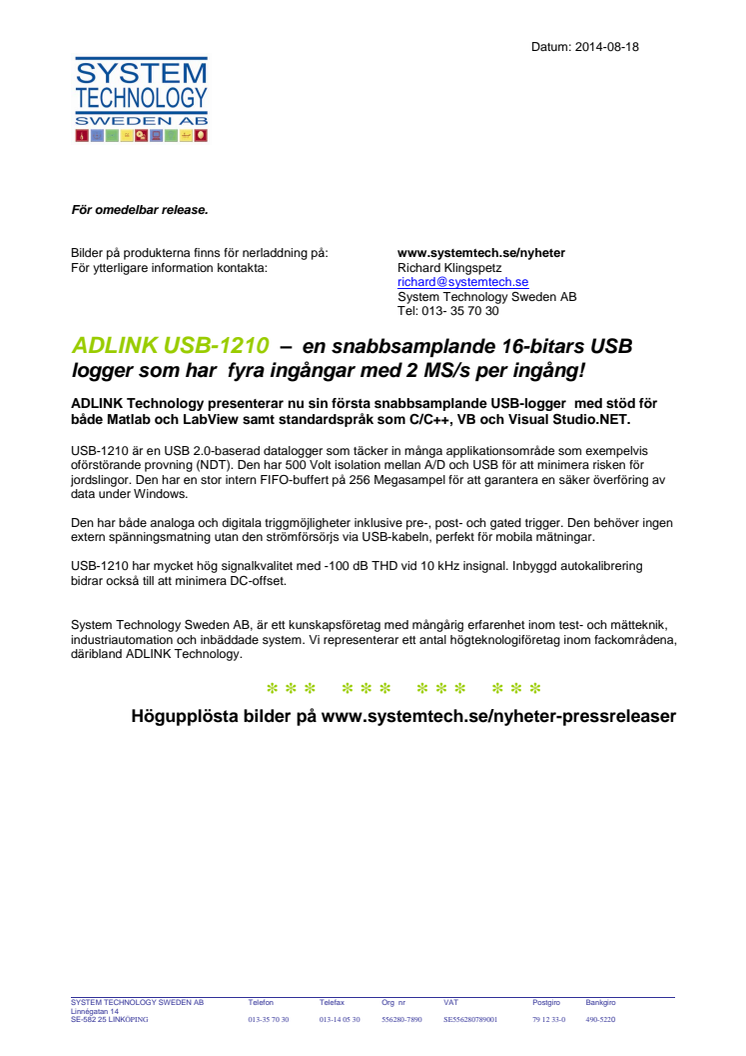 ADLINK Technology presenterar nu sin första snabbsamplande USB-logger med stöd för både Matlab och LabView samt standardspråk som C/C++, VB och Visual Studio.NET. USB-1210 har fyra ingångar med 2 MS/s per ingång.
