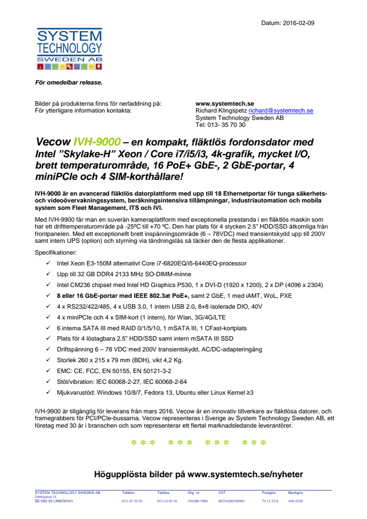 IVH-9000 är en avancerad fläktlös datorplattform med upp till 18 Ethernetportar för tunga säkerhets- och videoövervakningssystem, beräkningsintensiva tillämpningar, industriautomation och mobila system som Fleet Management, ITS och IVI.