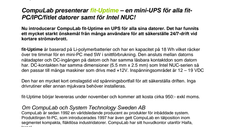 Nu introducerar CompuLab fit-Uptime en UPS för alla sina datorer. Det har funnits ett mycket starkt önskemål från många användare för att säkerställe 24/7-drift vid kortare strömavbrott.