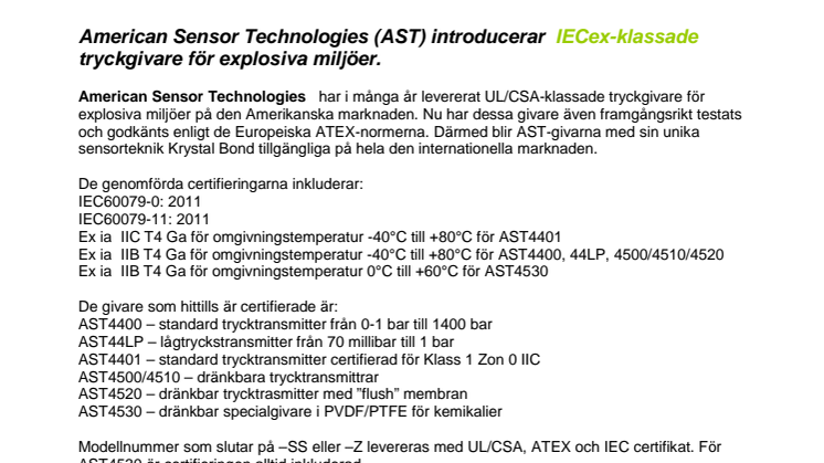American Sensor Technologies, AST, har i många år levererat UL/CSA-klassade tryckgivare för explosiva miljöer på den Amerikanska marknaden. Nu har dessa givare även framgångsrikt testats och godkänts enligt de Europeiska ATEX-normerna. Därmed blir AST-givarna med sin unika sensorteknik Krystal Bond tillgängliga på hela den internationella marknaden.