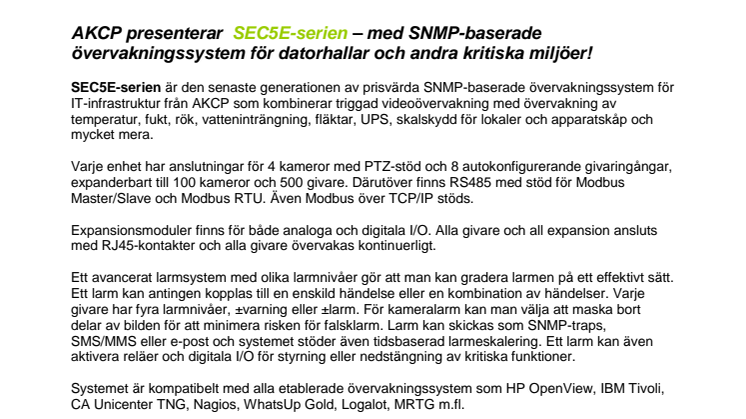 SEC5E-serien är den senaste generationen av prisvärda SNMP-baserade övervakningssystem för IT-infrastruktur från AKCP som kombinerar triggad videoövervakning med övervakning av temperatur, fukt, rök, vatteninträngning, fläktar, UPS, skalskydd för lokaler och apparatskåp och mycket mera.