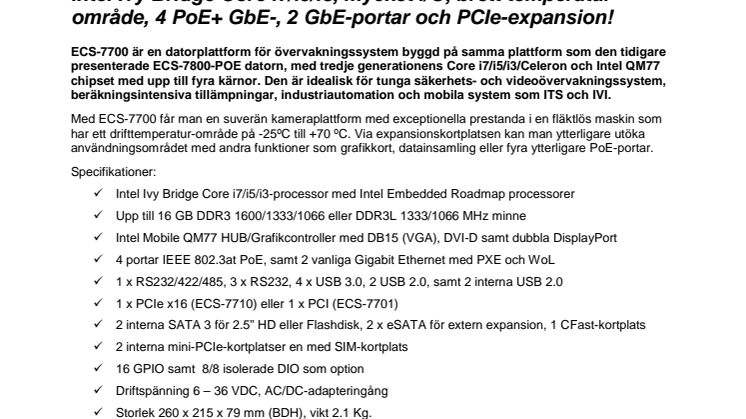 ECS-7700 är en datorplattform för övervakningssystem byggd på samma plattform som den tidigare presenterade ECS-7800-POE datorn, med tredje generationens Core i7/i5/i3/Celeron och Intel QM77 chipset med upp till fyra kärnor. Den är idealisk för tunga säkerhets- och videoövervakningssystem, beräkningsintensiva tillämpningar, industriautomation och mobila system som ITS och IVI.