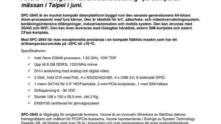 SPC-2845 är tillgänglig för omgående leverans. Vecow är en innovativ tillverkare av fläktlösa datorer, framegrabbers och mätkort för PCI/PCIe-bussarna. Vecow representeras i Sverige av System Technology Sweden AB, ett företag med över 28 år i branschen och som representerar ett antal marknadsledande leverantörer.