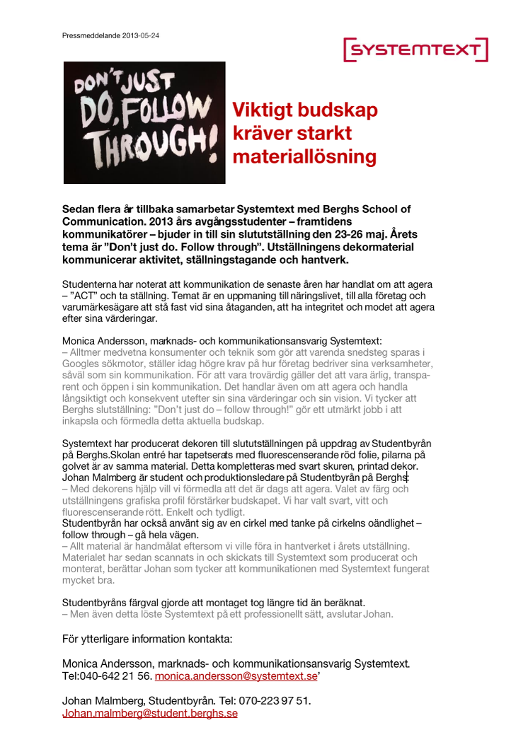 Sedan flera år tillbaka samarbetar Systemtext med Berghs School of Communication. 2013 års avgångsstudenter – framtidens kommunikatörer – bjuder in till sin slututställning den 23-26 maj. Årets tema är ”Don’t just do. Follow through”. Utställningens dekormaterial kommunicerar aktivitet, ställningstagande och hantverk.