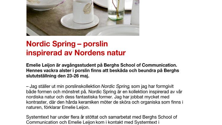 – Jag ställer ut min porslinskollektion Nordic Spring, som jag har formgivit både formen och mönstret på. Nordic Spring är en kollektion inspirerad av vår nordiska natur och dess fantastiska former. Jag har jobbat mycket med kontraster, där den hårda keramiken möter de sköra och organiska som finns i naturen, förklarar Emelie Leijon.