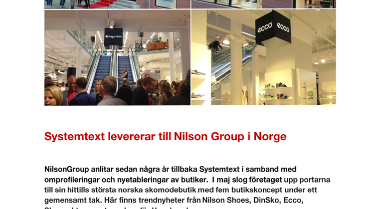 NilsonGroup anlitar sedan några år tillbaka Systemtext i samband med omprofileringar och nyetableringar av butiker. I maj slog företaget upp portarna till sin hittills största norska skomodebutik med fem butikskoncept under ett gemensamt tak. Här finns trendnyheter från Nilson Shoes, DinSko, Ecco, Skopunkten samt en shop för Vagabond.