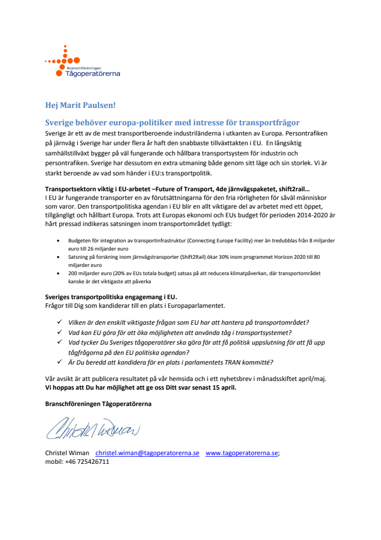 Valet till EU-parlamentet närmar sig. Transportfrågorna är viktiga både för Sverige och för ett öppet Europa. Tyvärr har Sverige i parlamentet inte satsat på transportsektorn under den nuvarande mandatperioden. Därför skickar Tågoperatörerna nu ett brev med frågor till alla kandidater i EU-valet. Vi ser fram emot alla svar på tågoperatörernas frågor!