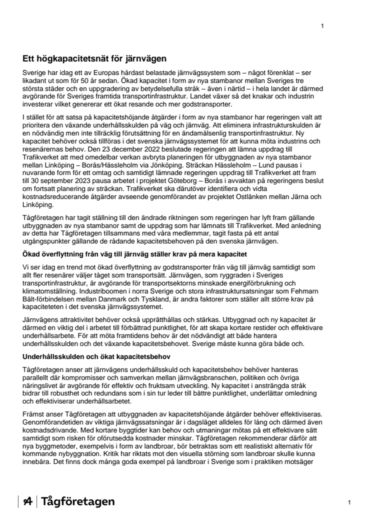 Tågföretagen har tagit ställning till den ändrade riktningen som regeringen har lyft fram gällande utbyggnaden av nya stambanor samt de uppdrag som har lämnats till Trafikverket. Med anledning av detta har Tågföretagen tillsammans med våra medlemmar, tagit fasta på ett antal utgångspunkter gällande de rådande kapacitetsbehoven på den svenska järnvägen.
