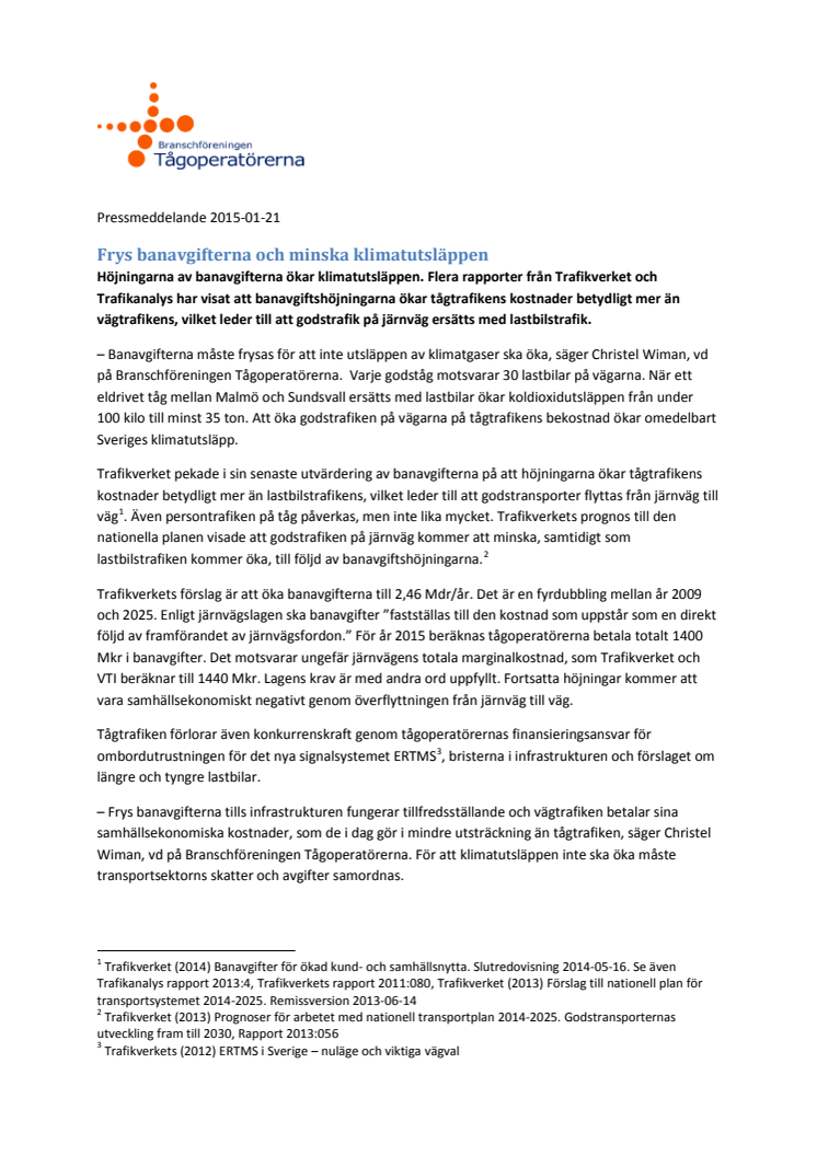 Flera rapporter visar att höjda banavgifter ökar klimatutsläppen. Godstrafiken på järnväg ersätts istället med lastbilstrafik. Varje godståg motsvarar 30 lastbilar. Banavgifterna kommer fyrdubblas mellan 2009-2025. Tågoperatörerna vill att banavgifterna ska frysas tills infrastrukturen fungerar tillfredsställande och vägtrafiken betalar sina samhällsekonomiska kostnader.