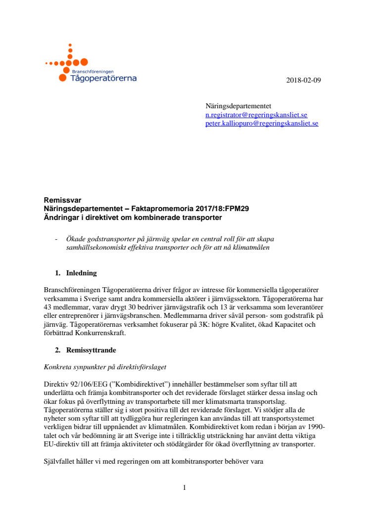 Tågoperatörerna svarade 9 februari på faktapromemoria 2017/18:FPM29: Ändringar i direktivet om kombinerade transporter. Remissvaret innehåller ett antal förbättringspunkter för att komplettera och ytterligare förbättra EU-kommissionens förslag.