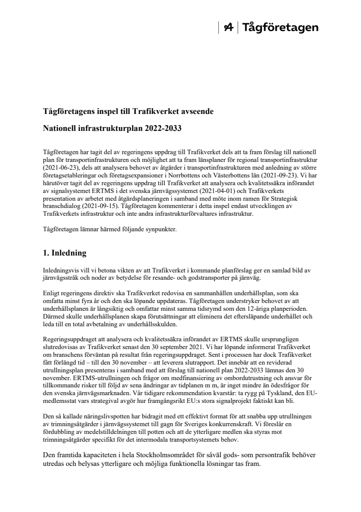 Tågföretagens inspel till Trafikverket avseende Nationell infrastrukturplan 2022-2033