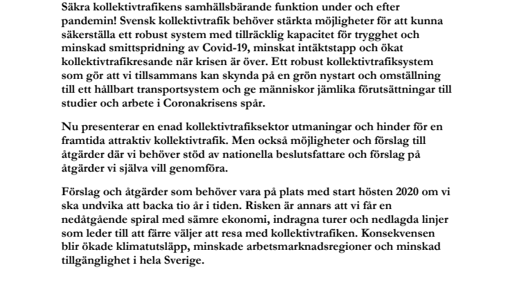 Dokumentet som överlämnats innehåller konkreta förslag till åtgärder som måste genomföras från hösten 2020 för att undvika att det minskade kollektivtrafikresandet och stora intäktsförlusterna under coronakrisen leder till en nedåtgående spiral med indragna turer och nedlagda linjer. En utveckling som kommer att leda till minskat kollektivtrafikresande, ökade klimatutsläpp, krympande arbetsmarknadsregioner och reducerad tillgänglighet i hela Sverige.