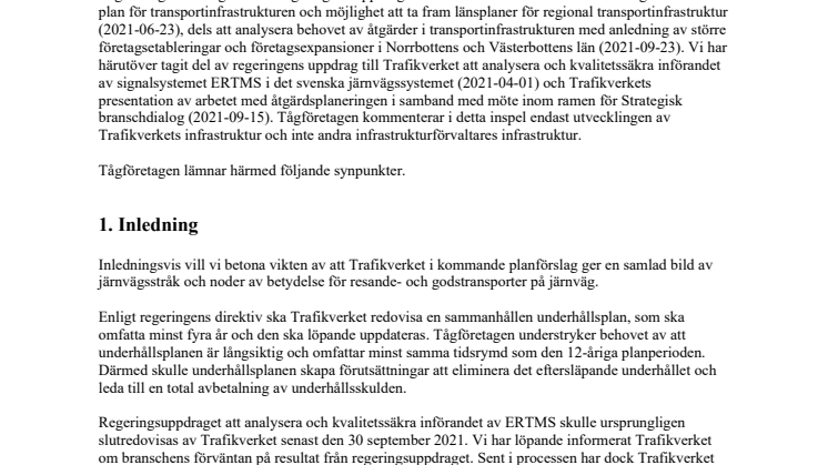 Tågföretagen vill att Trafikverket ger en samlad bild av järnvägsstråk och noder av betydelse för resande- och godstransporter på järnväg när de under hösten 2021 tar fram förslaget till nationell infrastrukturplan. Det skriver Tågföretagen i det inspel som skickades till Trafikverket den 1 oktober.