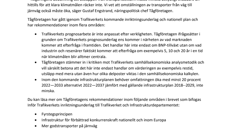 Du kan läsa mer om Tågföretagens rekommendationer inom följande områden i brevet som bifogas Inför Trafikverkets inriktningsunderlag till Trafikverket och Infrastrukturdepartementet:
