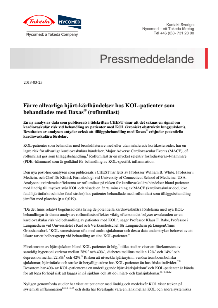 En ny analys av data som publicerats i tidskriften CHEST visar att det saknas en signal om kardiovaskulär risk vid behandling av patienter med KOL (kroniskt obstruktiv lungsjukdom). Resultaten av analysen antyder också att tilläggsbehandling med Daxas® erbjuder potentiella kardiovaskulära fördelar.