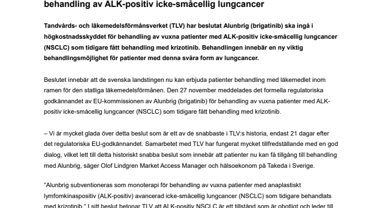 • ​TLV subventionerar ALK-hämmaren Alunbrig (brigatinib) för behandling av ALK-positiv icke-småcellig lungcancer
