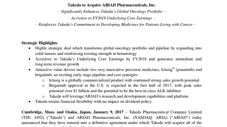 • Takeda to Acquire ARIAD Pharmaceuticals, Inc.