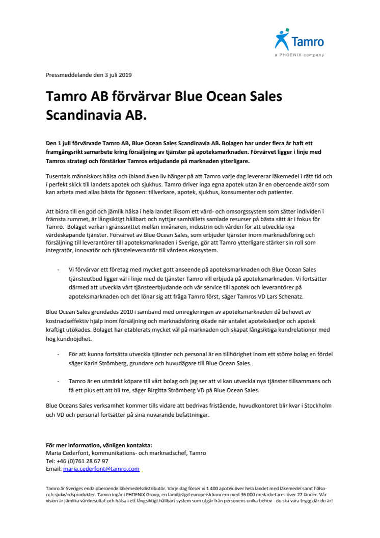Den 1 juli förvärvade Tamro AB, Blue Ocean Sales Scandinavia AB. Bolagen har under flera år haft ett framgångsrikt samarbete kring försäljning av tjänster på apoteksmarknaden. Förvärvet ligger i linje med Tamros strategi och förstärker Tamros erbjudande på marknaden ytterligare.