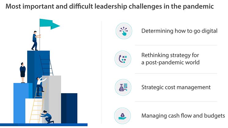 På frågan om att ranka de största utmaningarna på en skala från ett till fem svarade respondenterna "att hålla anställda fysiskt och emotionellt nöjda" (4,55) och "att gå över till distansarbete" (4,46) bland de tre viktigaste. Hela listan över utmaningar som cheferna står inför omfattade över tjugo punkter. Andra utmaningar som rankades högt var "fortsätta att betjäna våra kunder " (4.48), "hantera vårt kassaflöde och vår budget" (4.44) och "IT-säkerhet" (4.42)