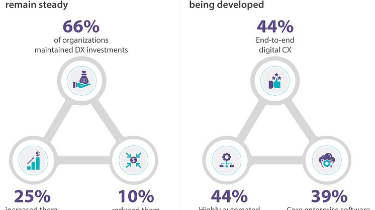 Trots dessa dystra siffror uppger 90 procent av organisationerna att de antingen bibehåller eller ökar nivån på sin digitala transformationsbudget (DX). Medan två tredjedelar (66 procent) av respondenterna har bibehållit sin DX-budget, har en fjärdedel (25 procent) ökat den under pandemin. Bland de som har avsatt ytterligare medel för digital transformation är den genomsnittliga ökningen 33 procent.