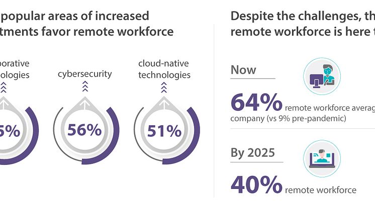 För den genomsnittliga organisationen som ingår i undersökningen har 64 procent av de anställda främst arbetat på distans under pandemin. Det är en sjufaldig ökning från 9 procent jämfört med genomsnittet före Covid-19. I Europa arbetar sju av tio anställda för närvarande på distans (70 procent), följt av Asien (67 procent) och Nordamerika (60 procent). Respondenterna förutspår att 40 procent av arbetskraften kommer att fortsätta arbeta på distans efter pandemin och fram till 2025. Anställda i den asiatiska regionen kommer mer sannolikt att arbeta hemifrån (45 procent) än européer (41 procent) och nordamerikaner (37 procent).