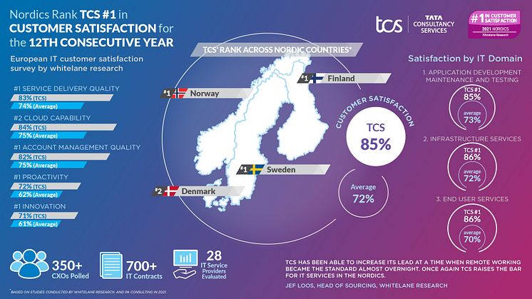 TCS etablerades i Norden 1991 och har i dag 15 000 medarbetare som arbetar för kunder i Sverige, Finland, Norge och Danmark. De senaste 11 åren har TCS i Norden rankats som den bästa leverantören av IT-konsulttjänster av sina kunder och TCS har dessutom utsetts till ”Top Employer” i Sverige, Norge, Danmark och Finland.